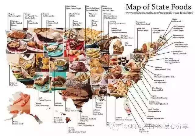 Lunch Time 午餐时间 近些年,《舌尖上的中国》等美食节目火遍全中国。我们在流口水的同时,也不禁暗暗感叹:原来中国有这么多我们从不知道的美食! 每一种气候,每一种习俗,每一种文化相互交融,总能孕育出迥然不同的产物。美食,就是体现一个地区鲜明特色的标志。 地大物博的美国也是如此,正所谓“一城,一味“,美国有多达50个州,每个州都有自己的代表美食。今天,就带你走遍美国的每一个角落,去尝尝正宗的美国风味。 煮花生阿拉巴马州把新鲜收获的“绿色花生”放在盐水中煮,这是阿拉巴马州人最心爱的路边小吃。 驯鹿肉排阿拉斯加州 驯鹿肉排是爱斯基摩人的传统主食,如果你来到阿拉斯加,一定要尝试一下。 炸面包亚利桑那州 亚利桑那州的炸面包用纯蜂蜜包裹,沾上黄油煎炸,最后撒上香肠片、碎牛肉、奶酪等,想想就很美味呀。 粉果番茄阿肯色州 阿肯色州曾有一个官方称号“水果州“,粉果番茄皮薄、肉厚、多汁、香甜,是阿肯色州人民的最爱。 水果冰沙加利福尼亚州 因为加州有众多热情洋溢的海滩,所以水果冰沙理所当然成为了加州人民的心头好。 山鳟鱼科罗拉多州 在科罗拉多州境内的落基山有一片野生水域,这里盛产肉质鲜美的银色鳟鱼。如果你有机会去科罗拉多州,一定要亲自钓上一条哦! 白蚬披萨康涅狄格州 康涅狄格州的沿海城市纽黑文,是吃白蚬披萨最好的地方。这里的白蚬披萨口感极好、配上大蒜和少许番茄,鲜香可口。 玉米肉饼特拉华州 若要形容特拉华州的玉米肉饼,“好吃不好看“是最恰当不过了。玉米肉饼的主要食材是猪下水和玉米面粉。 酸橙派佛罗里达州 佛罗里达州盛产的柑橘类产品占全美国的80%。这里的酸橙馅饼是美味酥皮和甜香炼乳的结合,它是佛罗里达州最受欢迎的甜品。 可口可乐佐治亚州 可口可乐的家乡就是佐治亚州的亚特兰大市。记得参观一下可口可乐世界博物馆,在这里你可以品尝到全世界60多个品牌的可乐饮料。 午餐肉饭团夏威夷 夏威夷的午餐肉饭团可以算是东西方文化融合的代表。它看上去和日本的饭团很像,甚至还包着一圈紫菜。 越橘爱达荷州 越橘的口感更像是酸一些的蓝莓。在浆果成熟的季节,采摘一些放在馅饼里,或是做成越橘奶昔,都是不错的选择。 芝加哥式热狗伊利诺斯州 芝加哥式热狗是全美著名的小吃,它是在罂粟籽面包中加入全牛肉热狗香肠,辅以洋葱、腌酸黄瓜等配菜。但绝对不会出现番茄酱,这也是芝加哥式热狗最任性的地方。 猪肉里脊三明治印第安纳州 印第安纳州人最爱的肉类就是猪肉,而猪肉里脊三明治就是对这种热爱的最佳诠释。 松肉三明治爱荷华州 爱荷华州的松肉三明治最为著名,把大量的碎牛肉放在两片圆面包中,不放任何酱料,只吃肉,这种简单粗暴的搭配瞬间满足你的口腹之欲。 爆米花堪萨斯州 美国人民一年要吃40升左右的爆米花,而大部分的爆米花就生产自堪萨斯州。这就足以说明,这里的爆米花有多好吃了。 炸鸡肯塔基州 “肯塔基州的炸鸡“就是鼎鼎大名的KFC的全称。所以来肯塔基州,一定要吃最正宗的开封菜(KFC)哦! 什锦饭路易斯安那州 路易斯安那州可以算是美国的“美食之乡“,这里的什锦饭堪称完美的代表,时蔬、火腿、肉类和米饭一拌,香辣的口感让全美人民都为之着迷。 龙虾缅因州 龙虾是缅因州的代表,这里的龙虾又大又新鲜,要是错过的话可真是吃大亏啦! 蟹饼马里兰州 在马里兰州的海鲜大排档,最受欢迎的,同时也是最多见的,就是蟹饼。 蛤蜊浓汤马萨诸塞州 浓郁鲜美的新英格兰蛤蜊浓汤,是马萨诸塞州人民冬季里的一抹温暖。 密歇根州樱桃馅饼 美国人民除了苹果派,最爱的就是密歇根州的樱桃派。 碱渍鱼明尼苏达州 用碱液浸泡过的白鲑鱼凭借后天加工的完美味道,成为了明尼苏达州的标志菜品。 油炸鲶鱼密西西比州 密西西比州的河边有众多的鲶鱼,油炸、烧烤或熏制都非常美味。