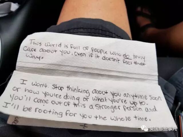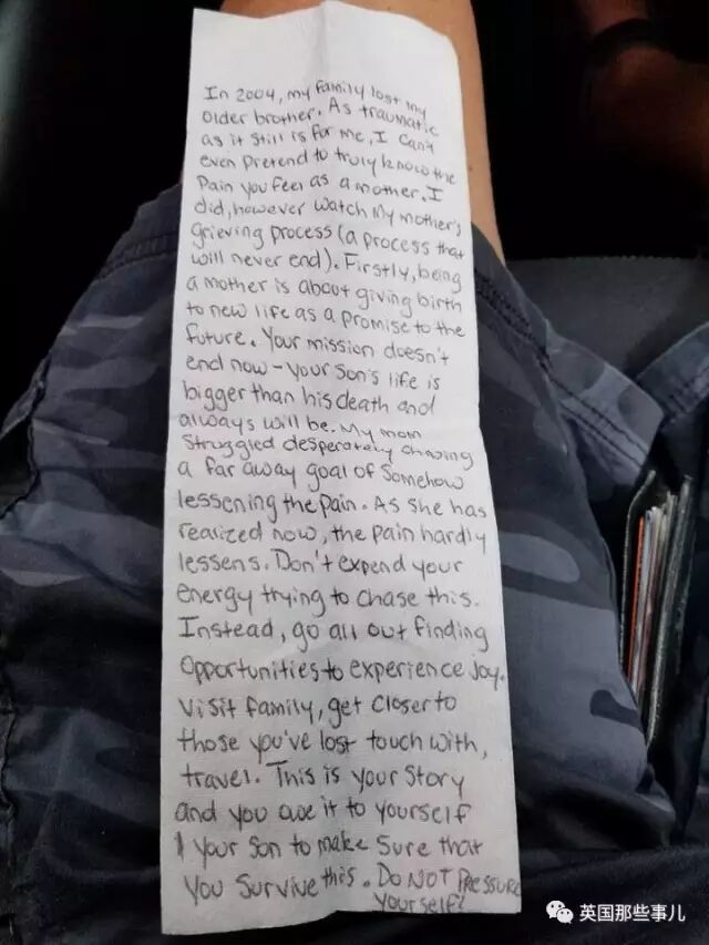 最近,一名叫Trisha Belstra的美国网友在FB上分享了一个故事... 8月18日,我坐西南航空的1076次航班回去。我很难受,看起来脸色也很差。我在两个陌生人中间坐下,手里拿着一个呕吐袋。一个空乘过来问我还好吗?我向他要了一杯水,另一人把水拿给我。 然后有个年轻的男空乘走到我旁边,问我们要喝点什么。我说我要一罐可乐,再要一杯水。他往我这边靠了靠说:你没事吧? 我跟他说,我这次飞回去是为了去埋葬我的儿子。 然后,他给我拿了一瓶水,一杯冰块,一罐可乐。 坐在我身边的女孩主动说帮我倒水,因为我的手一直在发抖。 飞机到达目的地后,女孩又帮我拿了行李。 我准备下飞机时,看到那个年轻的男空乘在门口等我。 他叫住我,递给我一张纸巾,然后对我说:听到我的遭遇,他真的很难过。走出通道后,我看了眼纸巾,瞬间泪流满面”。 在纸巾上,那个年轻的男空乘写道: “2004年,我失去了哥哥,直到现在,这种伤痛依然没有削减。我不能假装我能完全体会你的感受。但是,在我哥哥离世之后,我目睹了我妈妈的哀伤,这种哀伤,永远不会结束。” “我妈妈曾经非常努力得试图缓解丧子之痛带来的心碎感,但是她现在意识到,这种心痛是很难缓解的。不要花太多时间在这上面。尽量去做点能让你感到快乐的事吧,去拜访家人,去联系那些你长久没有联系的朋友,去旅行。” “在你离开后,我肯定没办法很快忘记你,我会一直想着你怎么样了,你要去干什么。经过这件事,你会变得更加坚强,我永远会为你加油。” Trisha不知道这个男空乘叫什么名字… 于是,她把这个故事po到网上,希望能找到他,跟他说一句感谢。 “我让牧师为他祈福,牧师说,这个空乘,是一个天使”。 ref http://www.news.com.au/travel/travel-advice/travellers-stories/a-grieving-mother-has-shared-the-heartbreaking-note-she-received-from-a-flight-attendant/news-story/ced07bcda7114f4417437227eaaec636 (来源:英国那些事儿 ID:hereinuk) |