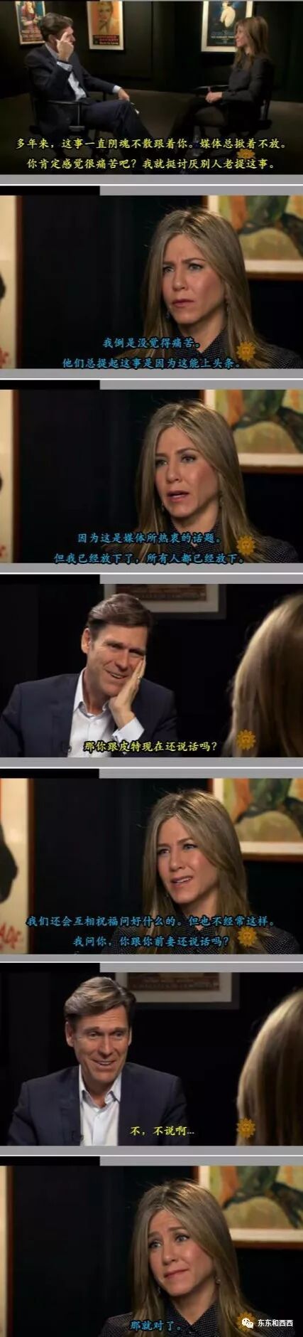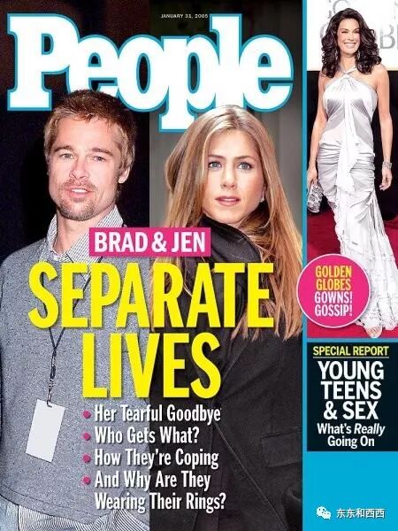 名利场这期是史上销量最高,至今这个纪录都没破 话虽这么说,但媒体可没打算放过她。她拍的电影让吃瓜群众各种浮想联翩。 片名:《他没那么喜欢你》 人设:大龄单身女 台词↓↓ 而皮特朱莉那边,孩子越来越多,隔三差五就是这种画风↓↓ 媒体于是一天到晚追问安妮斯顿,她的回答总是很机智大气。 2006年的时候,有记者问她:你是不是还在纠结离婚的事? 她直接怼回去:我觉得紧抓不放和纠结的是媒体。 2009年的时候,又有记者问她:你想到皮特和朱莉,他们那么恩爱,人们都在谈论他们,想到这些,你夜深人静的时候上会偷偷哭吗? 她回答:夜深人静的时候,我在睡觉。 甚至到2015年两人离婚10年后,还是有人问,这回答可以说相当漂亮了↓↓ 离婚后万事靠自己,安妮斯顿的赚钱能力在业内是数一数二的,年年都上《福布斯》,2017年是最赚钱女星收入第二名。 不光拍电影、代言,还推出自己品牌的香水↓↓对女人来说,有赚钱能力才有话语权。 亲自设计“连门把手都比你想象得大”的新家,并登上《建筑》周刊,专家看了都说好↓↓ 去年,她跟瑞茜·威瑟斯彭合作,自《老友记》后第一次出演美剧↓↓片子被各大公司疯抢,最后被苹果公司收购。这个女人,真是做啥啥都成。 感情生活也不是空窗,寻寻觅觅后2011年在《漫游》片场认识了现在的老公贾斯汀·瑟鲁斯↓↓2015年结婚。 各自有了另一半,还是会被媒体问到从前。2011年的时候,缺心眼皮特在接受访谈时公开捧朱莉,踩安妮斯顿,表示和安妮斯顿的婚姻很无聊。此话一出,被吃瓜群众骂出翔。最后搞到捐款100万美元到安妮斯顿经常资助的慈善机构,求谅解。 而2015年初,安妮斯顿在接受采访时,非常难得地开口聊了皮特,她说:感情这回事本就没有对错之分,所有美好的事情都值得去祝福,尽管我们之间已不再联系。 不光能聊到皮特,甚至能大方地谈到朱莉,说对方的《坚不可摧》拍得不错,“我觉得是到了该结束的时候,那些传闻就像一双旧皮鞋,现在我们就买双闪闪发亮的新鞋吧”。 跟皮特离婚的时候,安妮斯顿曾说: