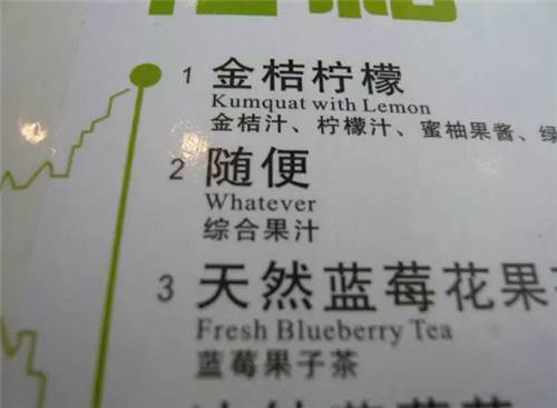 很多老外也非常爱吃中国的包子,比如下面这个视频中的小吃货,学中文也一口一个包子,爸爸的内心几乎是崩溃的! 然鹅,近日,有微博网友发了一张图,引发网络热议! 图片来源:@谷大白话 的微博 这,菜包子(steamed bun with vegetable stuffing)是怎么被翻译成白痴(idiot)的呢? 菜包子=菜包=白痴=idiot 嗯,这个翻译逻辑我是很服的!!! ![]() 那以后点餐,是不是就可以直接说:“老板,给我来俩白痴.....???” ![]() 不过,也有网友表示,这个翻译还不够信达雅,应该翻成:cai success(蔡成功)..........(看过《人民的名义》的人,应该都懂这个梗吧?) 其实,菜单一直是中式翻译重灾区,老外看到了真是筷子都要吓掉! 在国外网站boredpanda上,歪果网友就列举出了他们看到的菜单上一些让人困惑又超有趣的翻译。 来看看究竟是怎样的神脑洞! [size=14.4444px]“中餐菜单神翻译” 没节操型 1.干爆鸭子 F*ck the duck until exploded 看这道鸭子的菜名被翻的,老外吃的时候真的不会有心理阴影吗?? 正确译法:Braised Duck 2.干锅牛蛙 F*cuk a bullfrog 同上述鸭子梗,不解释 正确译法:Griddle Cooked bullfrog 3.各种干锅 看到这些黄暴直白的翻译,简直让人喷饭...谁译的?拉出去爆炒 正确译法:Griddle Cooked(干锅)+ fish head (鱼头)/+ springchicken(童子鸡)/+rabbit(兔肉) 还有,可怜的蘑菇也无辜躺枪了= = 恐怖型 4.野山椒牛肉 You and your family(你和你的家人) 难道进入了人肉叉烧包店?还是上演现实版电锯惊魂?太没人性了!!! 正确译法:Stir-fried beef with rod chilli 5.四喜烤麸变成了烤丈夫? Sixi roasted husband(四喜烤夫) 原来把老公烤了只需友情价16元,太便宜了。杀手都快失业了。 正确译法:Marinated wheat gluten with peanuts and black fungus 四喜烤夫16元,美味烤夫18元,看来要把老公煮得美味要多花两块钱 中文也写错了,应该是“烤麸”才对。也难怪德国汉学家顾彬这么说:“中国翻译问题在于母语不够好”。 6.夫妻肺片 Husbandand wife lung slice(丈夫和妻子的肺切片,这到底是什么鬼) 得多残忍才能干得出这事。细思极恐。 正确译法:Pork Lungs in Chili Sauce 顺便普及下我华美食山西篇:猫耳朵是一种在山西、陕西、等地流行的汉族传统面食,是因形似猫耳故名。 炒拨烂子也是山西人尝吃的一道家常饭,土豆裹着面粉先蒸后炒着吃。 风牛马不相及型 7.德国咸猪手 Germany sexual harassment:德国性骚扰(这真是一位灵魂译者) 餐厅公然卖“性骚扰”,不知道德国总理默克尔看见这道菜会不会抓狂? 建议以后这道菜别叫“咸猪手”了,改叫“咸味的猪手”,机翻说不定还能正常点。 正确译法:German-style salted pigs' feet 8.随便 综合(混合)果汁翻译成随便,坦白说,兔子先生内心竟对此译法无比赞同。 据称,新加坡真有两款叫whatever和anything的饮料,但好像已在2010年停产。 9.土匪猪肚 Many bandits:很多土匪 居然有如此诚实的店家,明确告诉你这是一家黑店。欺负老外没看过《龙门客栈》吗? 正确译法:Bandit Pig Lung 奇葩食材型 10.火盆杀猪草 The brazier kills the pig vegetable: 黄铜匠(火盆)杀死了猪和蔬菜。 这位译者真走心。 正确译法:Pigweed cook with brazier 猪草有对应的英语单词:pigweed。 11.王八炖猪肉 没想到龟仙人都会炖猪肉。 正确译法:Stewed tortoise meat and pork 12.支书扒茄子 Cell secretary digs up the eggplant:监狱秘书挖茄子?不明觉厉,印象中茄子不是埋在地下的。 正确译法:Grilled eggplant 不明觉厉型 13.私房香之驴 今年过节不收礼,要送就送大屁股。 释义:ass确实有“驴子”的意思,但同时也有“屁股”的意思。 正确译法:Private home cuisine of donkey meat 14.老干妈金钱肚 Old dopted mother money belly 不知道“老干妈”陶华碧老人家看到这样的翻译会作何感想。 老干妈辣椒酱已经风靡海外,大多数国外购物网站上老干妈都直接译成“Lao Gan Ma”,不过在Gilt网站上,“老干妈” 辣椒酱全称被译为:Lao Gan Ma Chili Black Bean Sauce 参考译法:Steamed Beef Tripe with Lao Gan Ma Chili Black Bean Sauce 15. 撒尿牛丸 Pee beef ball 囧囧囧,这……谁还敢吃啊。 正确译法:Juicy beef ball [size=14.4444px]“中国菜翻译的正确打开姿势” 看完这么多,涨姿势时间到: 一、以主料为主,配料或配汁为辅的翻译原则 1. 菜肴的主料和配料 主料(名称/形状)+ with + 配料 如:松仁香菇 Chinese Mushrooms with Pine Nuts 2. 菜肴的主料和配汁 主料 + with / in + 汤汁(Sauce) 如:冰梅凉瓜 Bitter Melon in Plum Sauc 二、以烹制方法为主,原料为辅的翻译原则 1. 菜肴的做法和主料 做法(动词过去分词)+ 主料(名称/形状) 如:拌双耳 Tossed Black and White Fungus 2. 菜肴的做法、主料和配料 做法(动词过去分词) + 主料(名称/形状)+ 配料 如:地瓜烧肉 Stewed Diced Pork and Sweet Potatoes 3. 菜肴的做法、主料和汤汁 做法(动词过去分词) + 主料(名称/形状)+ with / in + 汤汁 如:京酱肉丝 Sautéed Shredded Pork in Sweet Bean Sauce 三、以形状、口感为主,原料为辅的翻译原则 1. 菜肴形状或口感以及主配料 形状/口感 + 主料 如:玉兔馒头 Rabbit-Shaped Mantou 2. 菜肴的做法、形状或口感、做法以及主配料 做法(动词过去分词)+ 形状/口感 + 主料 + 配料 如: 小炒黑山羊 Sautéed Sliced Lamb with Pepper and Parsley So,看到这,知道怎么给老外介绍中国菜了吧! 其实,遇到不会翻的菜,这才是正确的打开姿势↓↓↓ 看看人家这机灵抖得,下次老外问你可别再一问三不知啦! |