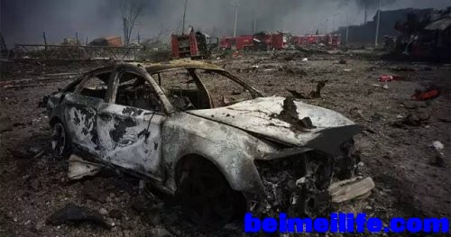 9 y( I: n% t/ X/ _. M, w天津爆炸现场,车辆烧毁狼藉一片。(网络图片)