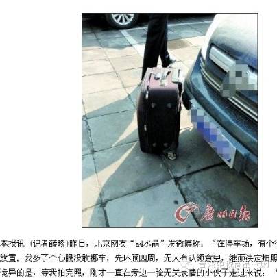 有网友在去取车时,这行李箱诡异的贴着他的车放置。他多了个心没敢挪。先环顾四周无人有认领的意思,继而决定拍照,先证明没动之前的状态。诡异的是等他拍完照,刚才一直在旁边一脸无关的小伙子走过来说:“不好意思挡你的车了。”他拎走了箱子,左前一辆挡路的汽车也随即开走,什么意思? 公安机关接到不少报案,说“里面是一堆碎瓷片,只要你一挪动箱子或者车一动碰倒箱子,然后就会出来N条大汉说箱子里是乾隆多少多少年的御制花瓶,价值多少多少万,然后就等着扯皮吧。报警的话也不一定有用,因为碎片有可能是真的………遇到类似情况请保持警惕,勿擅自移动箱子,一碰你就麻烦!先拍照再假装报警,等他们自己知道你难下手敲诈,他们就会自动拿走箱子了。这个很重要,尽快告诉你的朋友!