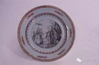 美国纽约大都会博物馆收藏一件乾隆中期锦地开光人物盘,主题纹饰绘音乐会场面,开光内画六人演奏,此纹饰模仿英国印刷品。