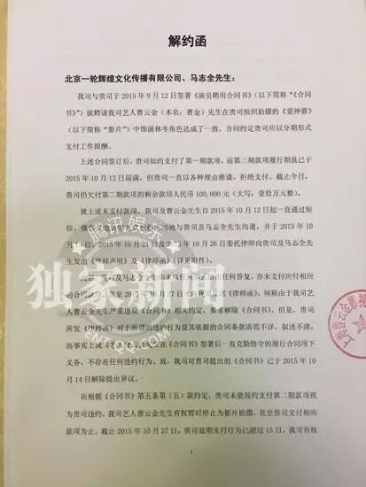 而打人事件后不久,全民星探也接到爆料,称曹云金在电影《爱神箭》剧组耍大牌,进组第一天即遭解雇。据该爆料用户称:曹云金要求至少住五星套房、以GMC的房车为座驾;当剧组无法满足其要求时,他便满大街找宾馆、以不出工要挟剧组、让全剧组等几小时;最后曹云金一场戏都没拍便在片场被当场开除,临走时连司机也表示已停止为其服务。曹云金方发文怒指是剧组违约在先(上图),而《爱神箭》剧组方向曹云金发送律师函要求索赔72万。