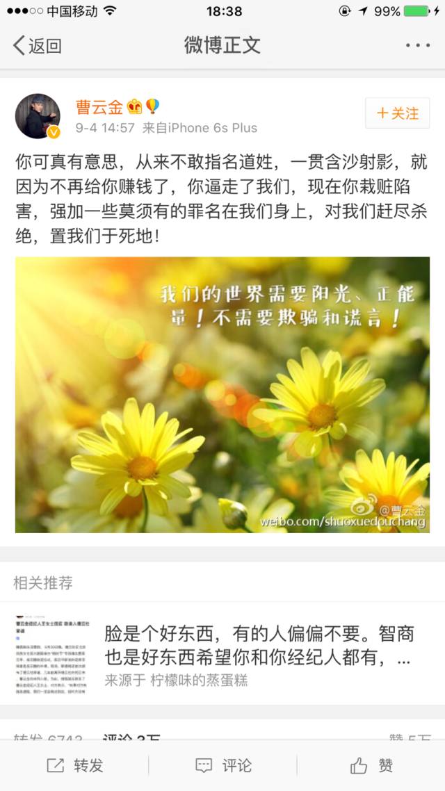" Q& T: t7 y% M* y3 T# y% m+ g曹云金突发长文《是时候了,也该做个了结了》,该文章经由微博、今日头条、微信同步放出,一经发出备受网友关注。短短几小时,转发评论数皆破了十万,反响十分热烈,不过从评论来看褒贬不一,有“一日为师终生为父”派、也有“郭德纲斤斤计较、仗势欺人”派。