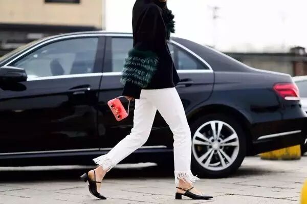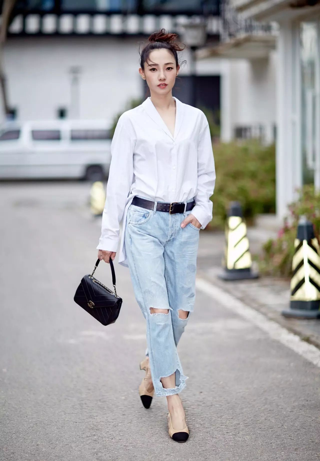 ! H3 k4 e' ^6 a8 f- l! O破洞牛仔裤与白色衬衫的休闲风格,穿上双色方跟鞋亦是清爽无比