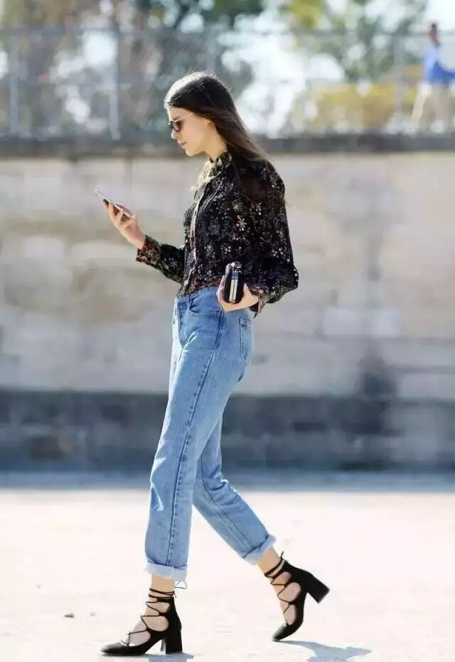 7 F: I" N8 E2 [* z! M: O' Y简单的黑色方跟绑带鞋子,搭配九分牛仔裤,也很显时髦优雅。