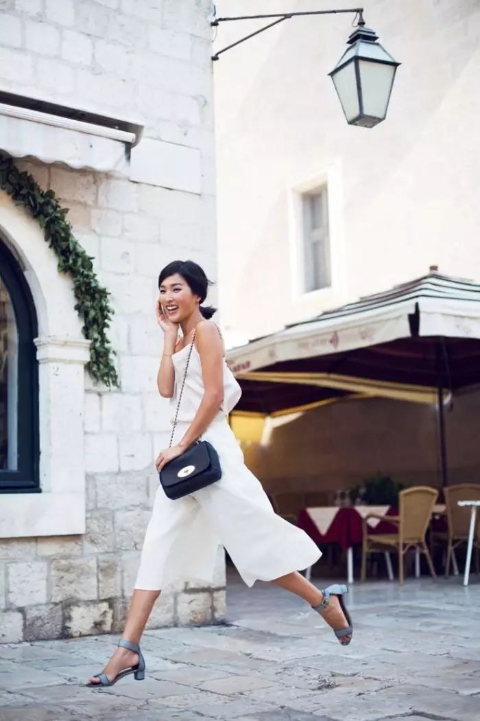 蓝色方跟搭配白色套装,有着蓝天白云的舒适惬意感