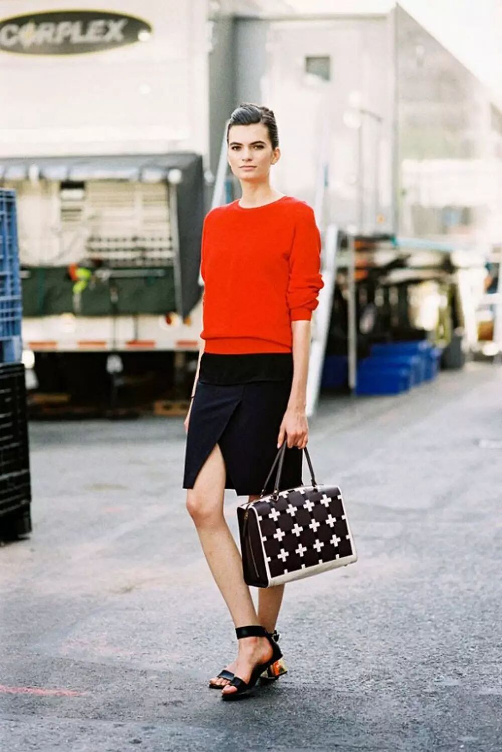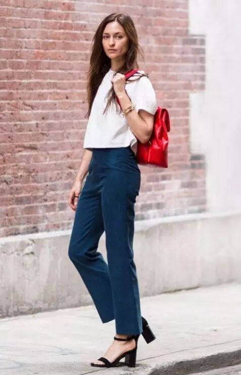 9 D1 [9 f" I# d* D8 q9 G红色鞋子也很百搭,九分牛仔裤和衬衫的穿搭显得干练
