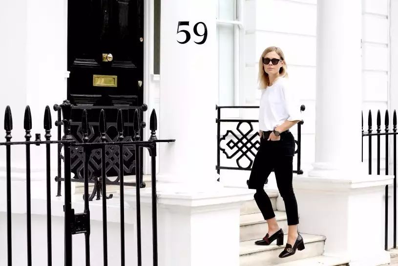 , p6 a" y2 Q" \简约的白T+黑色紧身九分裤,配一双充满英伦风的单鞋,女孩们也能穿得很帅气; M8 @) b8 n( l; ]" s
