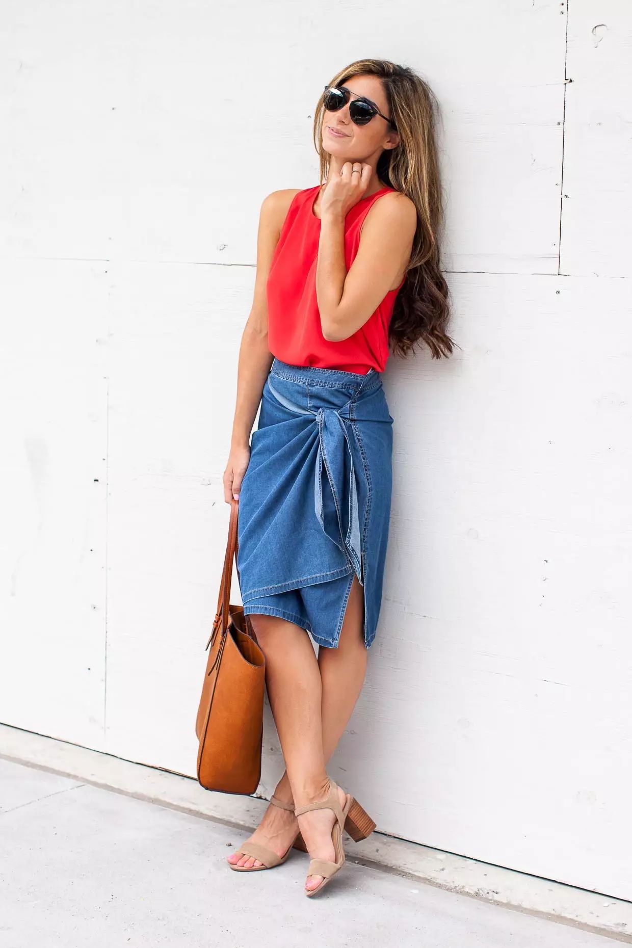 打造时尚大方的法则之一就是将颜色简单的单品融合,纯红色背心+蓝色牛仔裙+裸色方跟+棕色包包,没有颜色的赘余,行走的青春气息; [- C. F0 ?& D