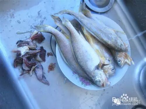 黄花鱼去腮、内脏,用水洗净。, Y d$ B, f. U# P% n