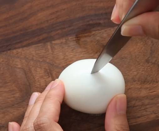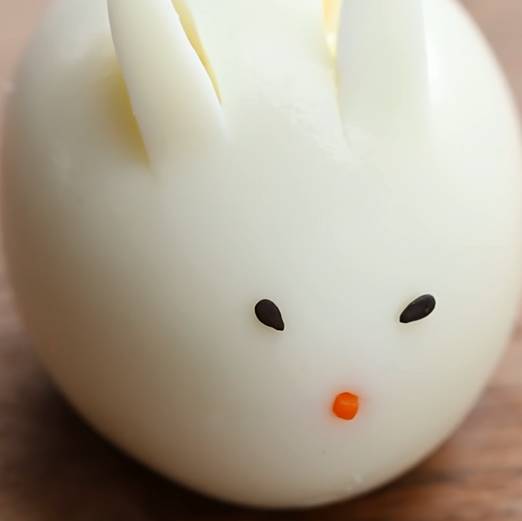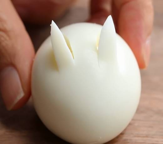 3.在鸡蛋表面两侧,用刀画一个“V”形,里面用步骤二的蛋白块填充,使耳朵更具立体感。