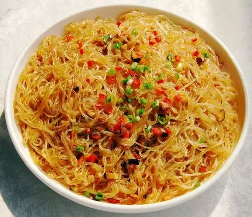 4、当变软出水时,下粉丝翻炒,放盐,让粉丝充分吸收炒出的水分;
