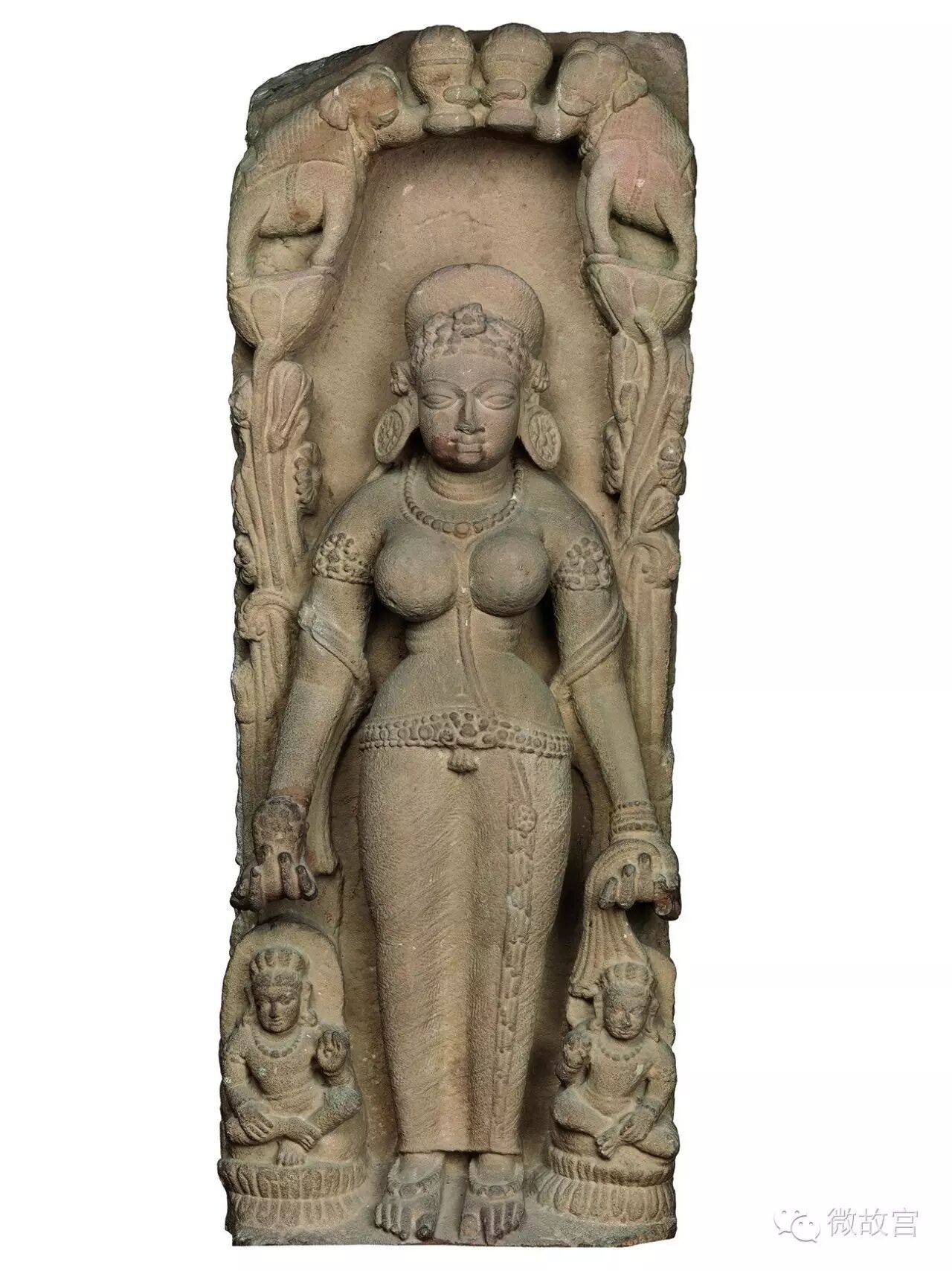 这尊像以浅黄色砂岩雕成。女神面部方圆,双眼鼓睁,头上发髻高束,戴有花冠,佩戴有大耳环、珍珠项链、臂钏、手镯和脚镯。双乳饱满浑圆,中间垂下有长长的胸链,从肩后绕过臂弯披有帛带;双手自然下垂,右手握有水果,左手握执帛带;下身穿有贴体斜纹长裙,腰间系有精美的腰带。女神身后两侧的莲茎上长有两朵莲花,莲花上各撑托有一只大象,翘起鼻子卷住水壶口朝下,为女神沐浴。女神双手下方各有一尊带头光的坐像,均一手扶膝,一手施无畏印,坐在仰覆莲座上。