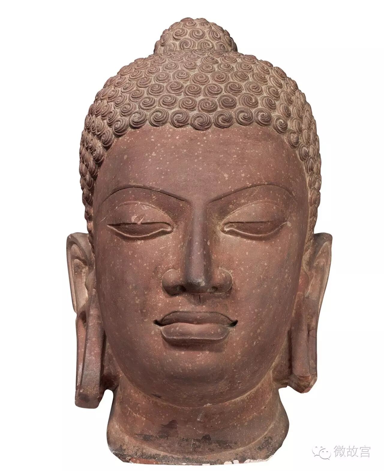 这件佛陀头像具是笈多时代马图拉样式佛像头部造型的典型特征。采用红色砂岩,精细打磨,人物线条有力,面部轮廓清晰。佛像的面容尽管按照三十二相的规定加以抽象化或程式化了,但一望便知仍是印度人特有的相貌。脸型更显椭圆,顶上肉髻覆盖着一圈圈排列整齐的右旋螺发。弓形的长眉,半闭下垂沉思冥想的眼睑,笔直的鼻梁之下的人中、下嘴唇异常肥厚的嘴唇均以凸起的棱线刻画。拉长的矩形耳垂与颈部的三道褶痕符合三十二相的规定。