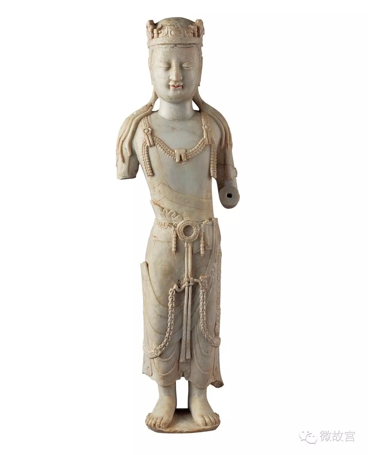 ' h9 b2 b0 t# P2 T# h, ^- Q: I0 U这是2012年在河北邺城遗址出土的一件菩萨立像,是北齐造像中的精品,选用了曲阳一带所产白石,光洁莹润,表面经过精细打磨之后宛如白瓷。菩萨造型饱满敦厚,下垂的眼睑和略带笑意的嘴角,与同时期的印度笈多造像有异曲同工之妙。简洁的衣纹配以精细雕琢的璎珞,裙子前面的部分采用镂空立体雕饰,以完全写实的细节衬托出菩萨像整体简约俊逸的气质。
