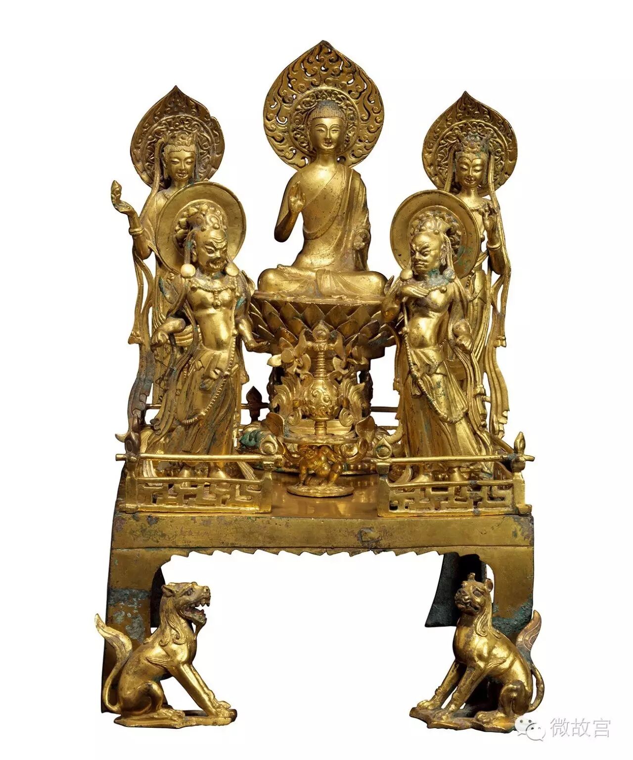 这铺铜鎏金造像为一佛二菩萨二力士的人物组合,加上台座和狮子,保存完好,鎏金精美。台座后侧所刻发愿文称:“开皇四年七月十五日,宁远将军、武强县丞董钦敬造弥陀像一区……”,可知这是公元584年所造的一铺阿弥陀像。主尊肉髻低平,脸型偏圆,眉毛以阴线刻出,双目细长,嘴角上翘,面带微笑。身着袒右肩袈裟,左手向前平伸,右手抬起,掌心向外,施无畏印,姿态清秀自然。佛的两侧立胁侍菩萨,体型细瘦,宝珠形头光,头戴宝冠,缯带从宝冠左右垂至膝侧,下着裙,披挂璎珞等饰物,帔帛搭于两臂,垂于体侧,跣足立于莲花座上。左侧菩萨右臂自然下垂,平托一莲蕾,左臂上举,捏宝珠。右侧胁侍菩萨右手举与肩平,持莲蕾,左手置于胸前,手心朝下。两菩萨的前面是二力士,稍稍侧身握拳,竖眉鼓目,嗔目怒视,衣裙随着人物的姿态动作飘向一侧,与相对静止的佛与菩萨形成对比,渲染出一触即发的力量感。两力士中间为地神托举博山炉,地神一手撑地,另一手与歪向一侧的头部承托底盘,圆形平托上有莲花与莲叶簇拥的博山炉。带有护栏的台座四边开壸门,前面两侧有相向蹲立的狮子,昂首挺胸,前腿伸直,筋肉鼓起,充满着紧张感,似乎随时都会一跃而起。这铺铜鎏金造像保存完整,造型和做工均十分考究,是隋代金铜造像中的精品。