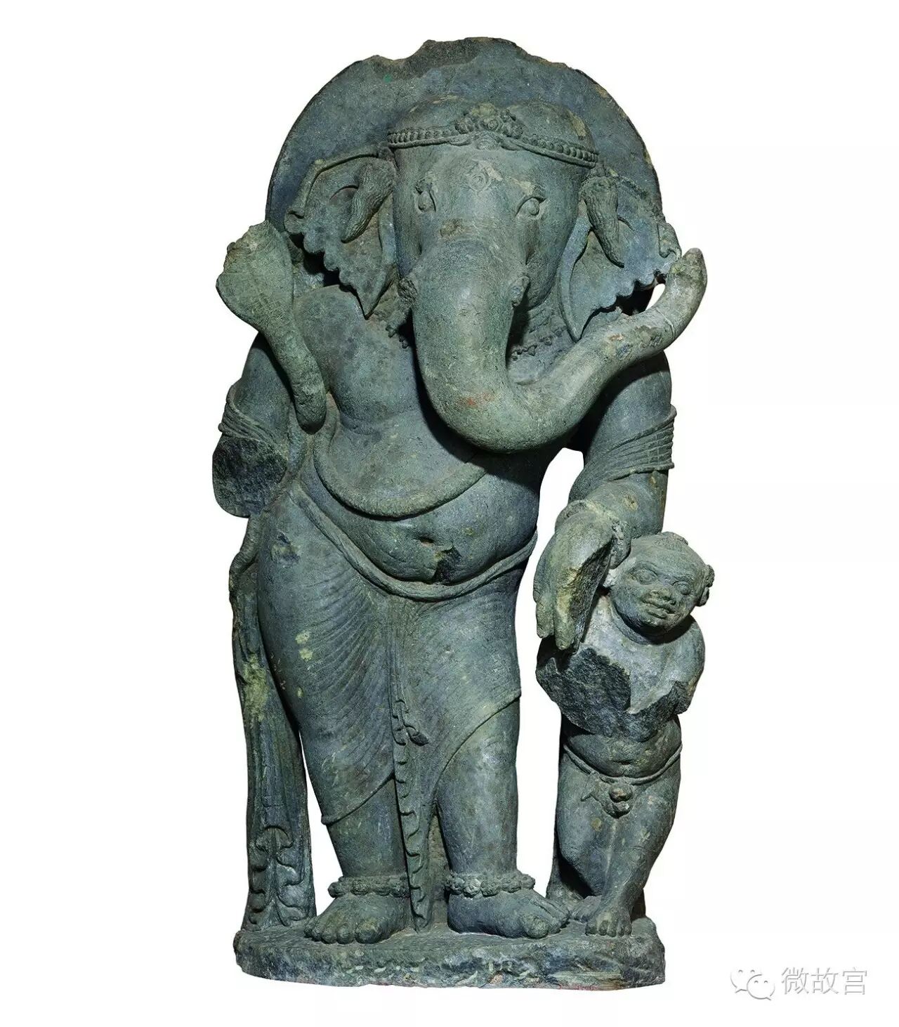 象头神迦纳什一般被认为是湿婆和波哩婆提的儿子,最突出的标记是象头,关于它的起源有多种传说。这尊象头神呈象头人身,一面两臂,雕刻精致,生动传神,臀部略向右提,左腿略弯,站姿优雅;象头部分雕刻得尤其精妙,长长的象鼻向左上卷起,象牙已断,象耳如同簸萁,以此象征从真理中驱除邪恶,如同从谷物中分离糠秕。头上戴有一周珠子串起的冠饰,中央装饰有宝石花叶和流苏,头后有朴素的平板头光。他的右臂从肘部开始大部分残缺,左臂搭在站在他左侧的侍从半裸侏儒迦那的右肩上。迦那的形象粗短肥胖,憨态可掬,面带微笑,除腰间系带外几乎全裸。他上身袒露,大腹便便,据称他的大肚皮象征着富足和安康。脖颈处戴有项链,从左肩斜披一条交缠的蛇带,两条长长的披帛从肘弯处垂下,在下方形成厚厚的褶皱,端头呈波浪状;下身穿有斜纹裙子,阴线刻出衣纹,右腿露出膝盖,脚踝处戴有珠串脚镯。