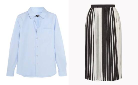 A.P.C。 府绸浅蓝色衬衫;Topshop 黑白百褶百褶裙; P5 |- C7 p, T; F