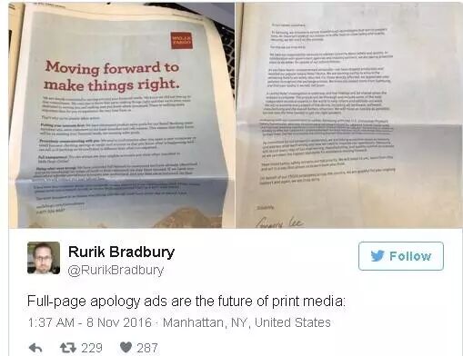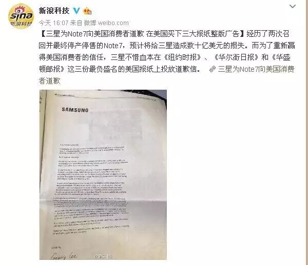 9月29日,三星电子在其官网表示,该企业在Note 7爆炸一事上没有完全考虑消费者感受,进行了不充分的说明,因此对中国消费者表示最真诚的歉意,并称在召回问题上不存在双标。