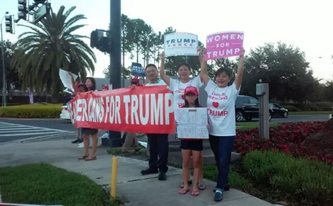 佛罗里达州特朗普助选团团长范文莉(Lily C.)是挺川阵营里的积极分子之一,11月6日,范文莉一行为特朗普举牌站街拉票(范文莉供图)。