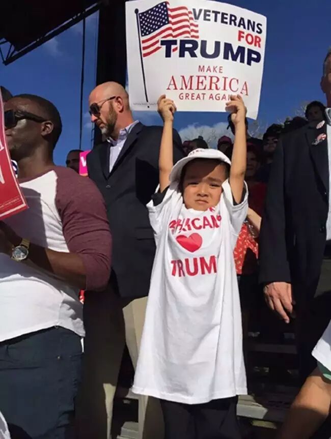 $ }. I# L5 W- l5 O- W当地华人家庭携家带口出席特朗普的竞选集会。