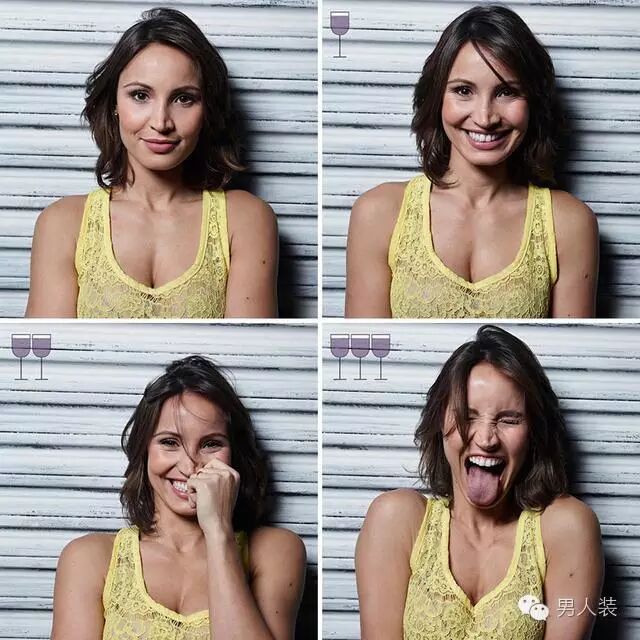 酒精有多大的魔力,以下是妹子(喝酒前、喝了一杯酒、喝了两杯酒、喝了三杯酒)的放飞过程,你可以很直观看到她的变化。