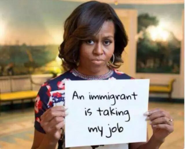 , }' i2 @6 G! r" p' i米歇尔满脸愁容举着标语:“我的工作被移民抢走了”。 即将接任第一夫人的梅拉尼娅(Melania Trump)生于斯洛文尼亚,1996年持工作签证来到美国,5年后获得绿卡,2015年成为川普的第三任妻子。