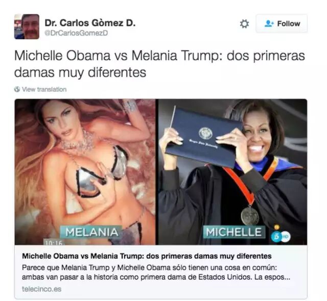 " x* |! b3 ]1 i比如这张照片,就是在嘲笑即将上任的第一夫人梅拉尼娅的英文蹩脚。