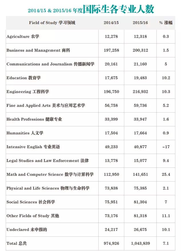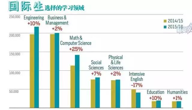 Open Doors数据表明,2015-2016学年,工程科学、数学与计算机科学的就读学生数量激增:工程学科已经超越商科成为最热门留学专业,人数达216,932,占总人数的21%;数学与计算机科学专业人数涨幅高达25.4%,共141,651人就读。