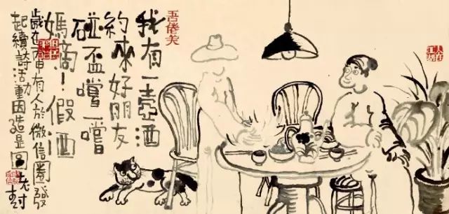 6 Y9 B. d1 ` \( b很多网友戏称老树的这些文字为打油诗,那些看似俏皮的三言两语,其实都有着很好的韵律感和讲究。老树知道后,也不多解释:“你们说是打油就打油吧,我也没必要争辩。”因为对他来说写诗就像他画画一样,“自由表达才是最重要的。
