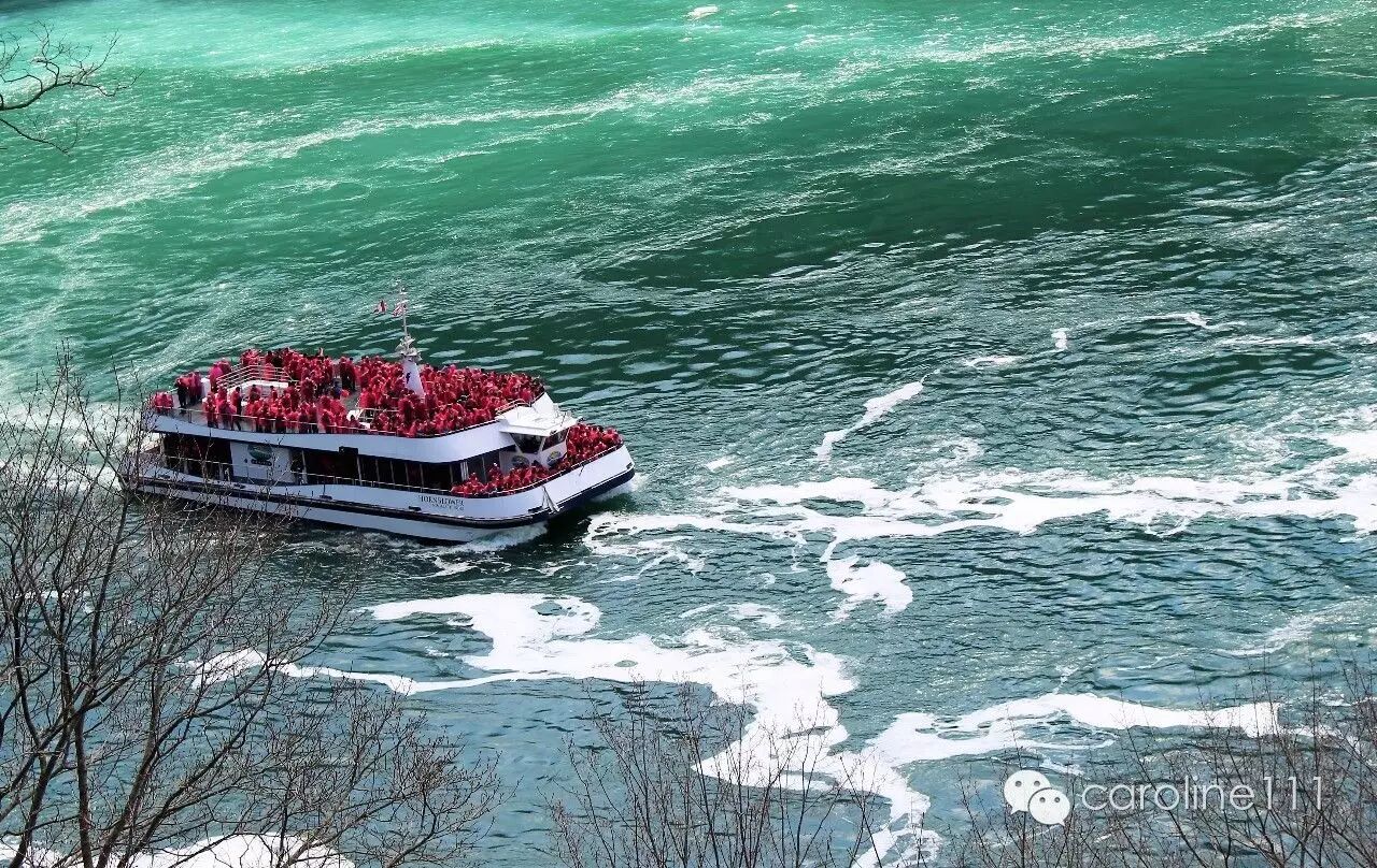 红衣游客是在加拿大坐船观览,蓝衣游客是在美国坐船欣赏瀑布。