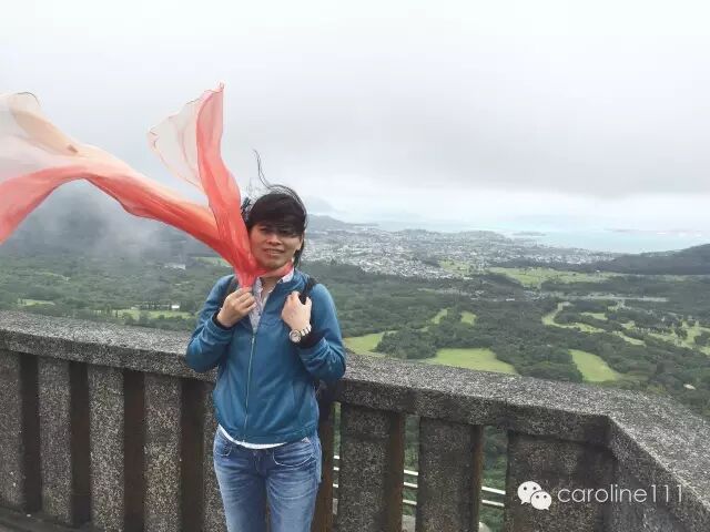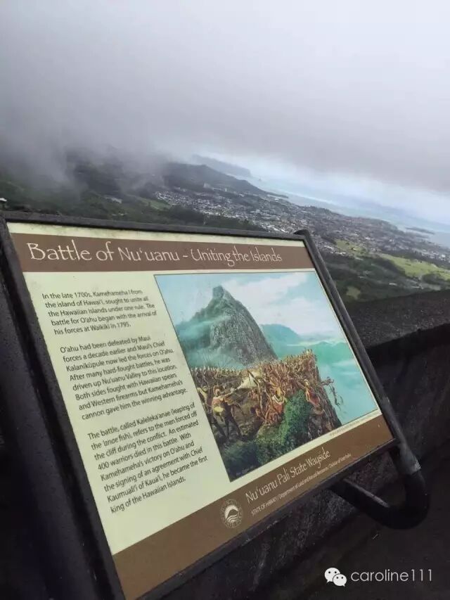 , ?/ M1 m! K+ X6 g 午餐后游览神秘的大风口古战场,它坐落在Nuuanu Pali州立公园,是欧胡岛一处著名风景点。贯穿整个欧胡岛东岸的Koolau山脉是创造欧胡岛的古火山残骸。连绵不绝的山峰只在大风口一带出现了一个缺口。无论是人,还是风,都理所当然地把这里作为穿越山脉的最佳途径。夏威夷的62号公路,Pali Highway,选择在这里穿过Koolau山脉,将岛东北角的两座城市Kailua和Kāneohe与岛中心火奴鲁鲁连接起来。从这里登高而望,岛东北平原的风景一览无余。