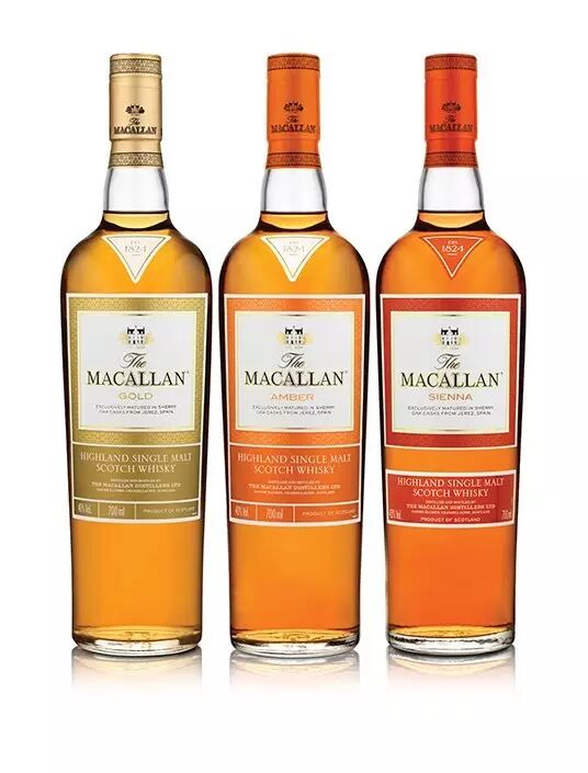 麦卡伦1824系列以不同的橡木桶精酿出不同颜色的威士忌,酒色由浅到深,口感华丽、层次丰富。酒款包括灿金、琥珀及赭石红。