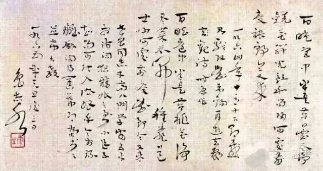 而康生书法最大特色是带章草味道的行书。所谓“康体”,其实是章草韵味的笔墨。章草是汉魏之间出现的一种书体,至西晋,章草开始向今草演化;至唐,章草几于绝迹:历数百年至元代以后,才又复兴章草,风格已大异于古人。