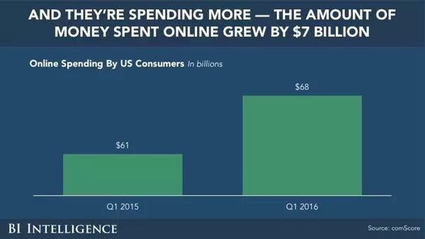 5 u* w' X6 c3 z- ^5 jBI Intelligence就制作了一些图表,探究了电商业的趋势。其中的一些主题包括:- y1 o2 @: S) x
