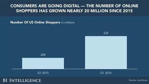 消费者也慢慢变得数字化。网上购物的消费者自2015年以来增加了近2千万人。4 @2 ~6 S5 G1 `9 Z6 K