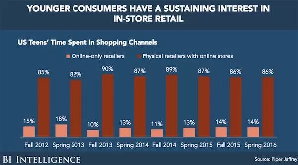 & C" x! q- s5 [2 N+ T但是你以为青少年都转向了网购,那你就错了,其实,青少年在实体店消费的金额远超过在网上消费的金额。看来享受商场里的购物氛围,仍然是年轻人追求的时尚。" H" g" \: N' Z+ Z, ], |