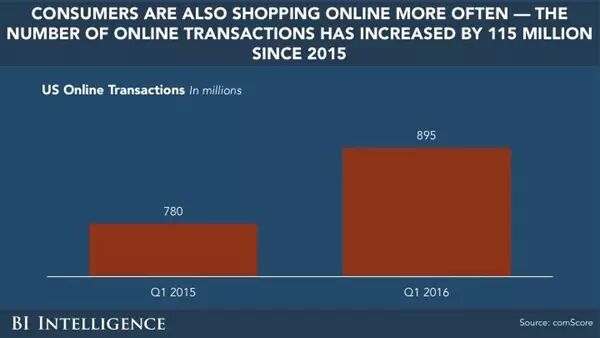 * D' C$ M; }5 L- U消费者越来越多的选择网上购物,网上交易额自2015年以来增加了1.15亿。( f9 e" Q3 y+ z7 E) l3 A/ G