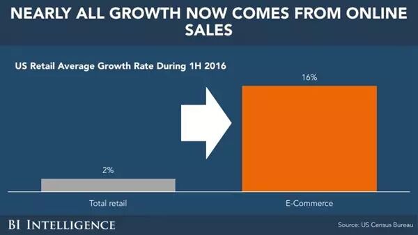 ) m4 `1 \0 N# _几乎全部销量增长都源自网上购物。网上购物增长16%,然而实体零售只有2%; r: R* C, J7 U" g