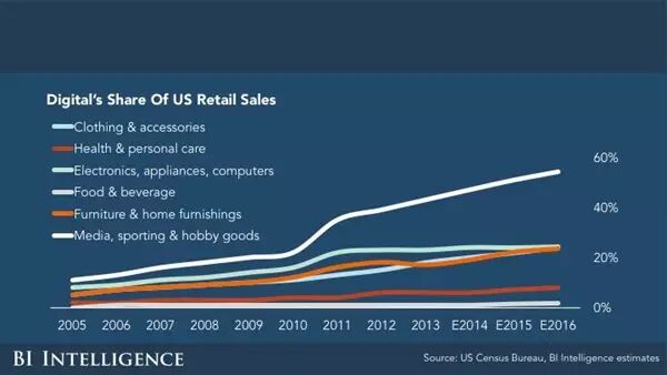 不论什么类型的商品,自2005年以来至今,在数字媒体上上的销售都在持续增长,增长最为迅速的就是媒体,体育、家具家居、服装类产品。食物和饮料因为保质期等问题,增长的趋势不大。