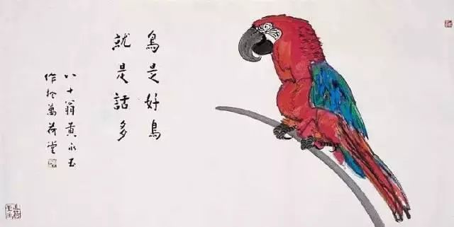 虽然年事已高,但黄永玉画画的速度依然很快。有时记者去采访他,吃个午饭他就能画出一幅大作。他的灵感好像是喷涌而出的,而那份幽默感却凸显其中。他的画里常常配有各种幽默诙谐的话,如画了只憨态的小老鼠,他写“我丑我妈喜欢”,让人捧腹。画了一只鸟,他写“鸟是好鸟,就是话多”,老辣精准。有人质疑黄永玉的画浓墨重彩,不能算国画。老先生懒于回应,只开玩笑说谁再说他的画是国画,就要告他。