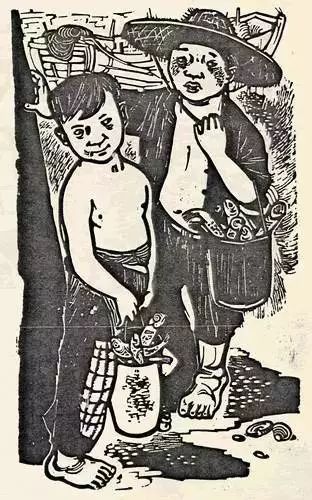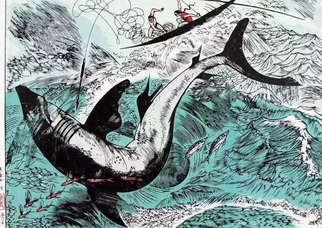 2 |# M9 Q+ @& P$ k+ A他的木刻刀功犀利,线条粗犷,画面精细,也是玩出来的。《春潮》里,鲨鱼翻滚扭腾成弧形,钓鱼线错乱得简直毫无章法,却将“惊涛骇浪拍岸起”表现得淋漓尽致,人与动物之间共通的生命气息似乎喷涌而出。黄永玉十来岁时喜欢上木刻,便自己鼓捣着,还曾因把办公室搞得像木工坊而被辞退,他却乐此不疲。后来以《春潮》和《阿诗玛》轰动中国画坛。