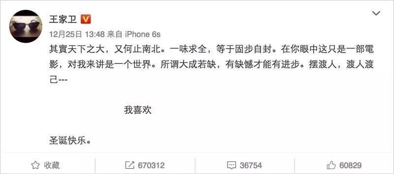 更让人诧异的是,王家卫自己居然还发了微博说喜欢《摆渡人》。 r2 Y' i# b/ A+ s, r