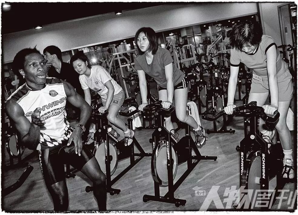 2000年11月,上海淮海中路的健身房,美国教练在辅导上海女人健身