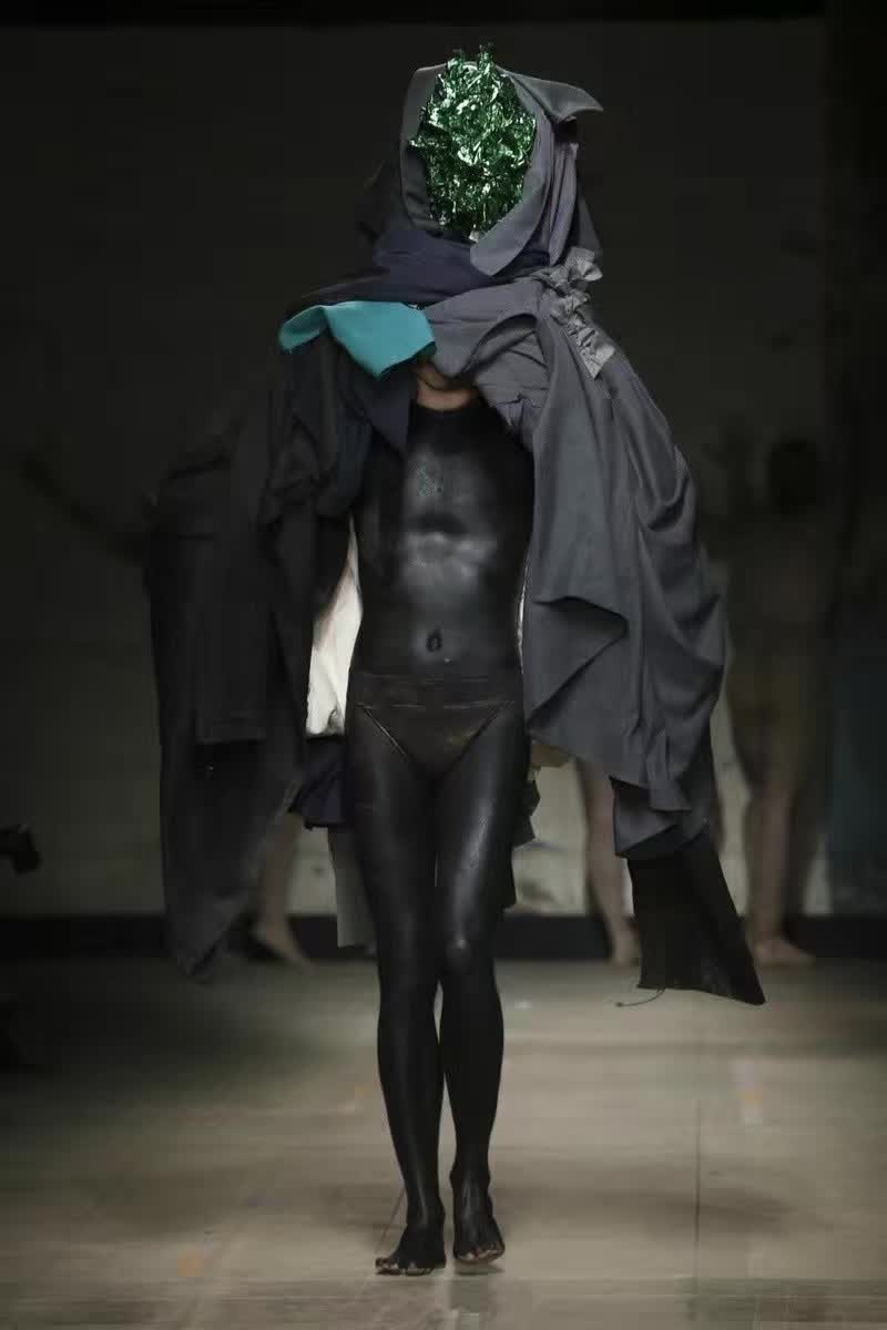 被涂上灰泥的模特们,朝着秀场中央的模特伸出了双手