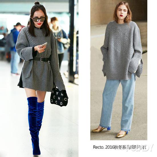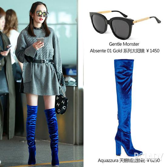 8 {% X5 a3 L; h$ F/ i& `5 o 大幂幂最近是盯上过膝靴了,任何搭配都少不了过膝靴加持,而且这次过膝靴是全身的亮点,天鹅绒的款式也是大热的材质,廓形毛衣加了条腰带凸显腰线。但相对于之前,这次的过膝靴褶皱太多,好在大幂够瘦,不然就要暴露腿粗的low点了。so,小腿粗的强迫症妹子,一丝褶皱没有就对了。