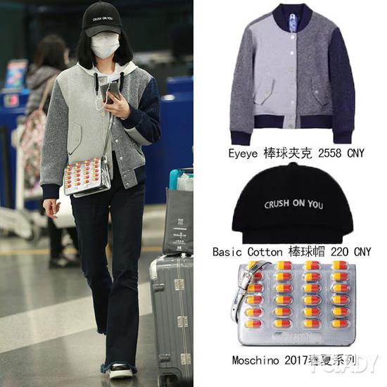 刘诗诗这身look看起来太低调,拼色夹克外套内搭白色帽衫,下穿黑色毛边牛仔喇叭裤,黑色字母鸭舌帽,这身暗色系搭配全靠Moschino金属色药丸包提亮整体造型了。