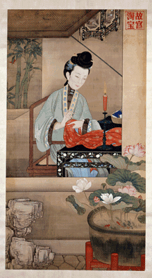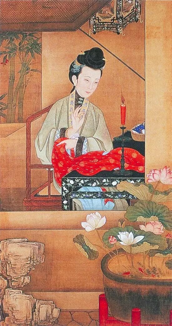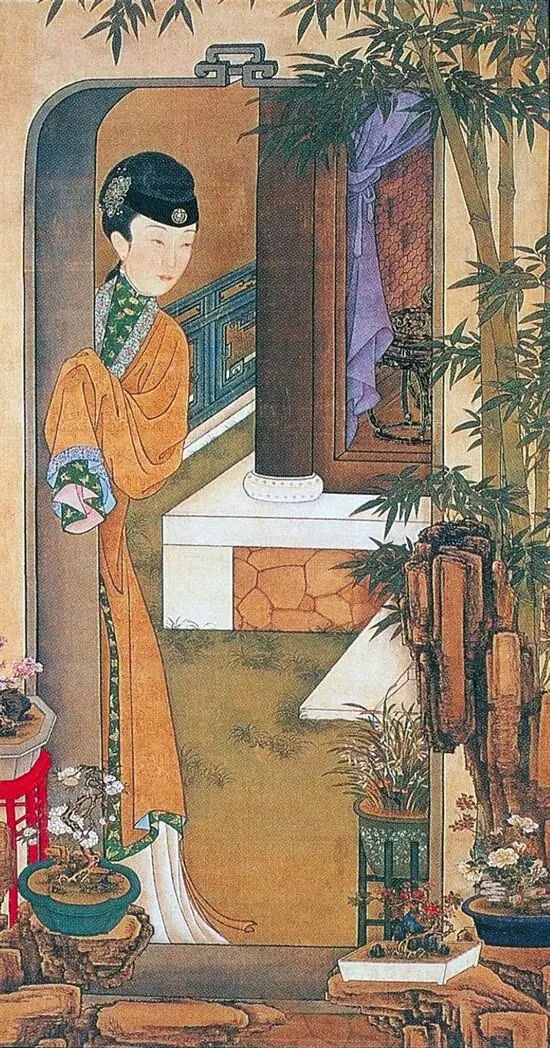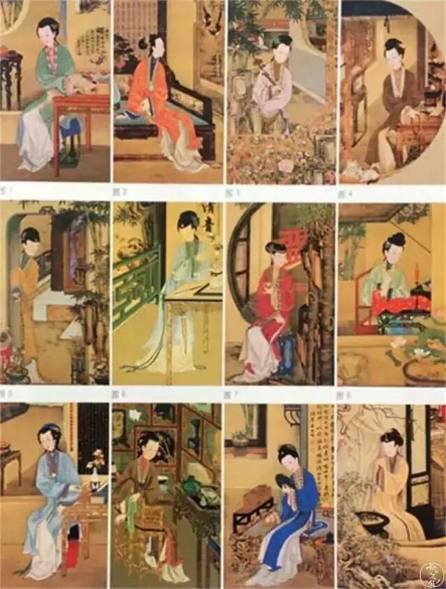 # e6 G" [3 e$ t: ^& L* ?+ B# x《十二美人图》分别描绘12位身着汉服的宫苑女子品茶、观书、沉吟、赏蝶等闲适生活情景,同时还以写实的手法逼真地再现了清宫女子冠服、发型、首饰等当时宫中女子最为流行的妆饰。